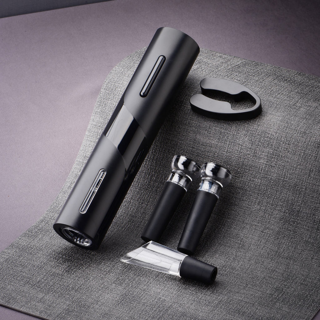 Prático cortador de lacres de alumínio. Elegante abridor elétrico de vinho que funciona com 4 pilhas AA, basta apertar um botão para remover a rolha. Bomba a vácuo que elimina o ar da garrafa, mantendo as propriedades do vinho por mais tempo.