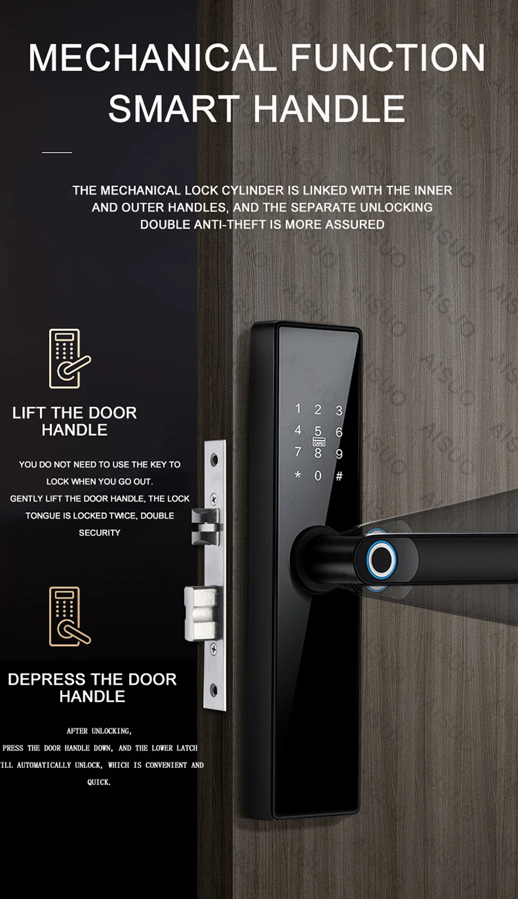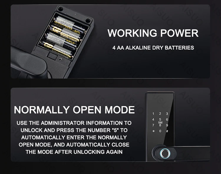 Você só precisa levantar a alça para travar duas vezes, e o painel traseiro pode ser travado com uma chave, o que é mais seguro; modo normalmente aberto: só precisa usar as informações do usuário administrador (impressão digital/cartão magnético/senha) para desbloquear, digite 5+#, então o modo normalmente aberto pode ser mantido, e o modo normalmente aberto será fechado automaticamente após desbloquear novamente com as informações do administrador.