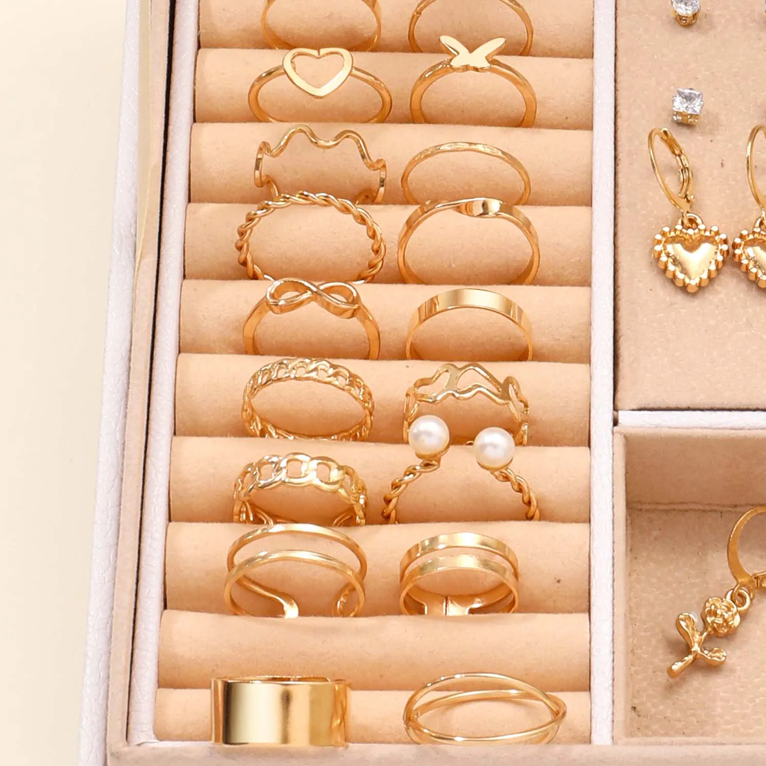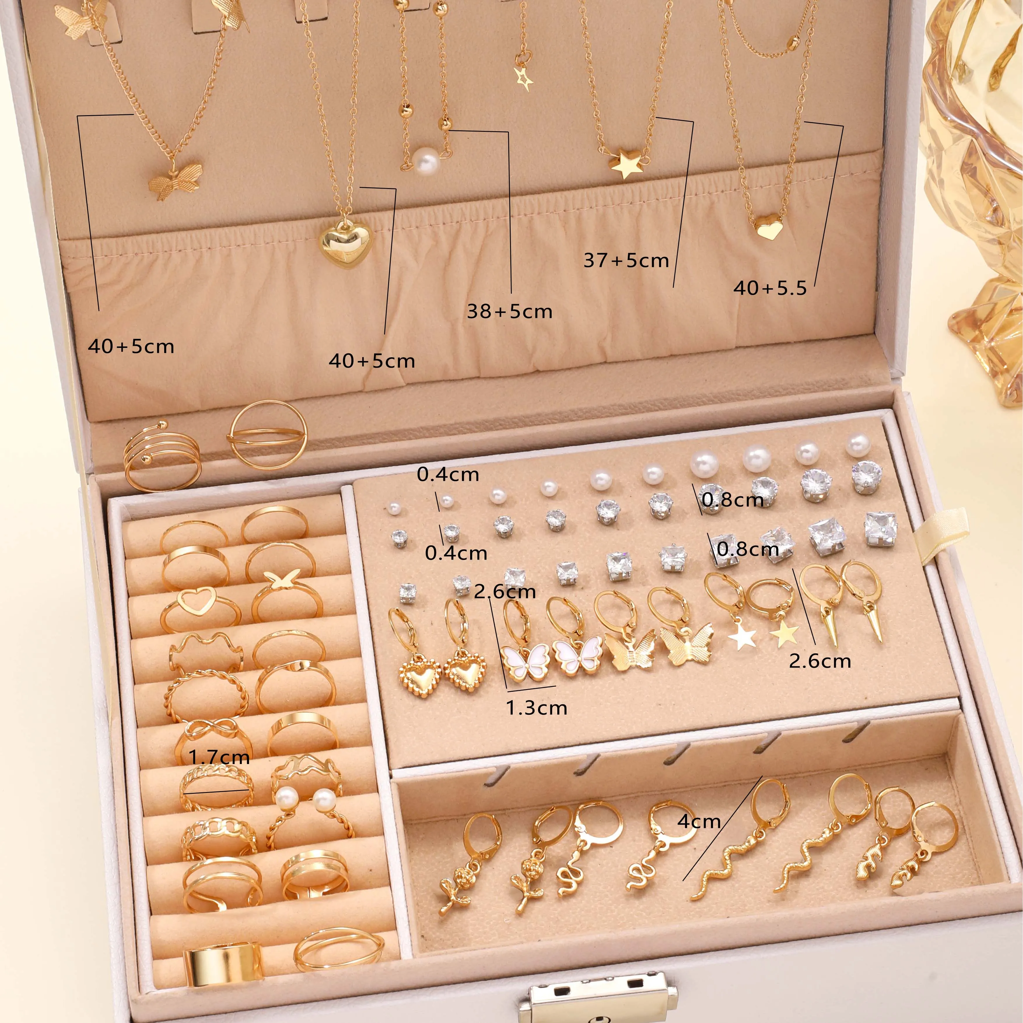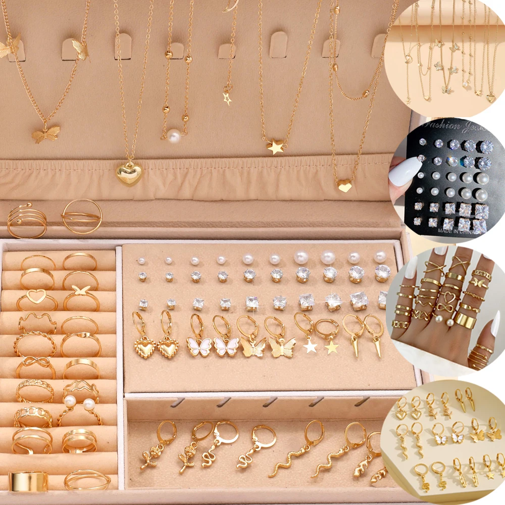 Categoria: brincos + colar + anel + conjunto de joias para unhas Cor: Dourado Forma: Borboleta Quantidade: 84 peças Temporada aplicável: verão Público-alvo: Mulheres Ocasiões aplicáveis: presentear Atenção: A caixa é usada apenas para exibição do produto e não há caixa para o produto real Embalagem: saco OPP