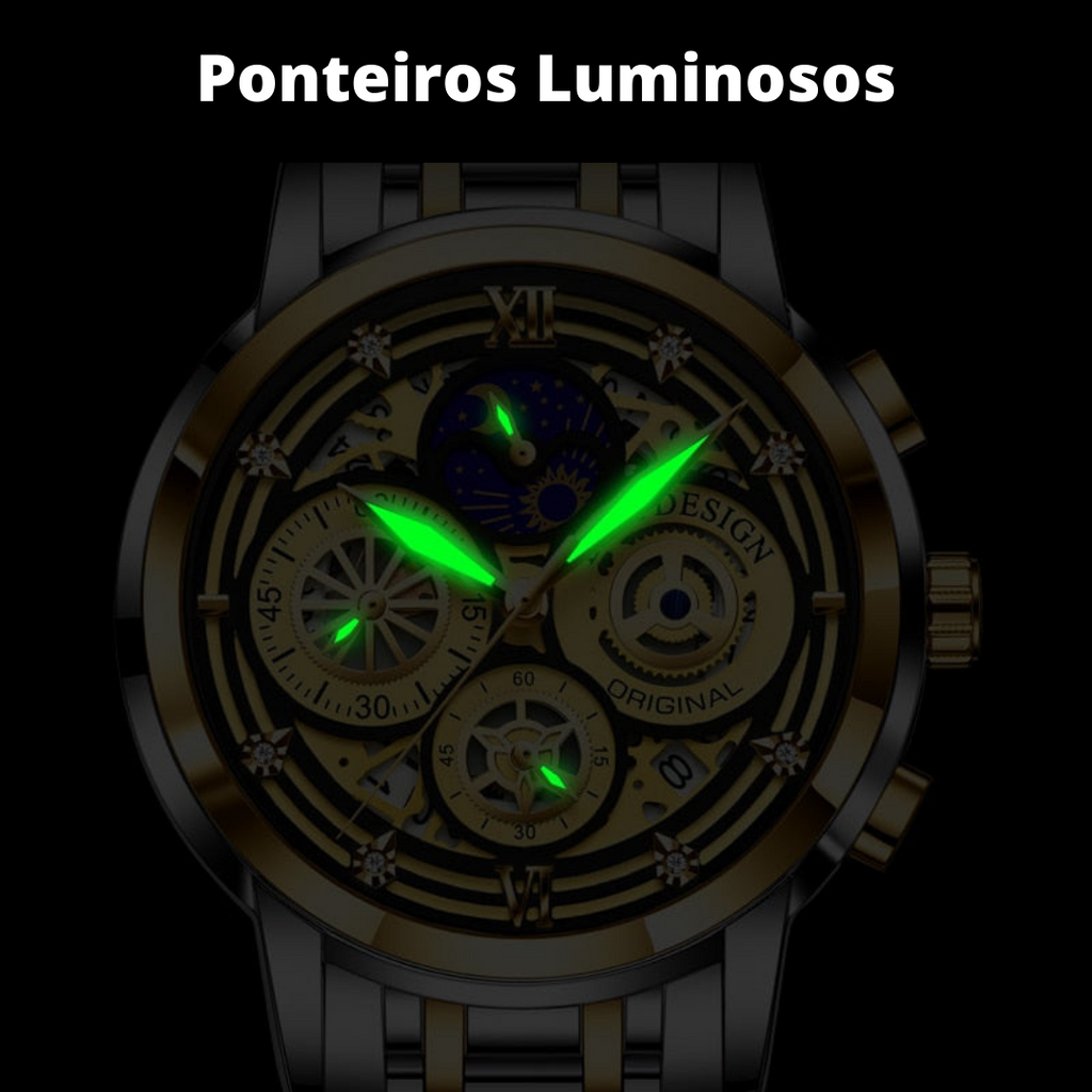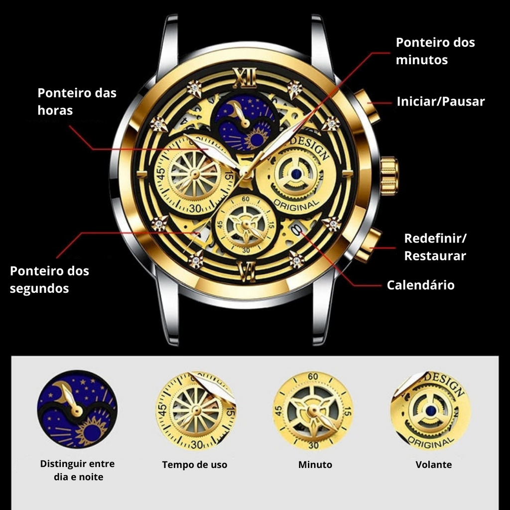 - Características: Cronógrafo, Calendário automático, Data automática, Fases da lua, Cronômetro, Ponteiros luminosos